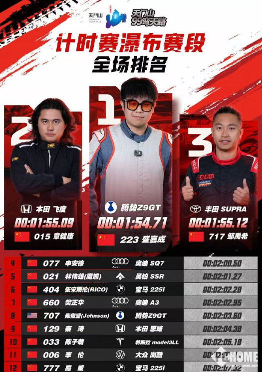 中国车手盛嘉成驾驶原厂未改装的腾势Z9GT以1分54秒71的成绩获得计时赛冠军。这个成绩在瀑布赛段创造,参赛车辆包括多国改装性能车。此外,这是全场唯一未改装的夺冠车辆,战胜了丰田Supra等传统性能车。多个认证账号强调这是中国新能源车的重要里程碑,尤其在5.2米长车身的D级车中实现灵活操控实属罕见。