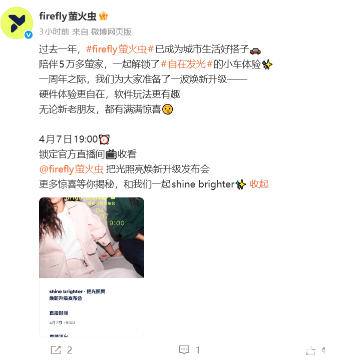 PChome 4月3日消息,蔚来汽车官方宣布,旗下firefly萤火虫焕新升级发布会将于4月7日19:00举行,并将为现有车主推出专属升级方案,实现与新款车型体验对齐。