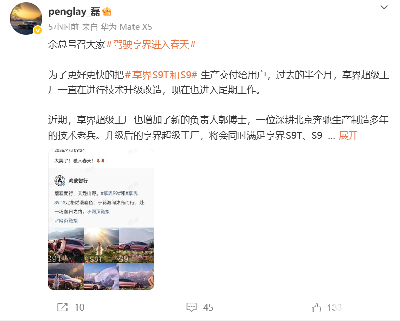 PChome 4月3日消息,华为智选车享界系列产品总监彭磊今日发文宣布,享界超级工厂技术升级已进入尾声,待改造完成后,将加快享界S9/S9T车型交付进程,并同步启动全新SUV与MPV车型的生产试制,进一步丰富产品矩阵。