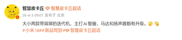 PChome 4月3日消息,博主“智慧皮卡丘”发文爆料,小米18 Pro、Pro Max两款旗舰将继续搭载背屏,并升级为AI智窗交互形态,打造高端旗舰差异化标识。
