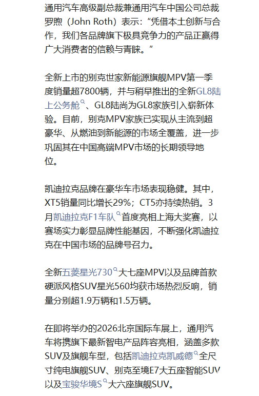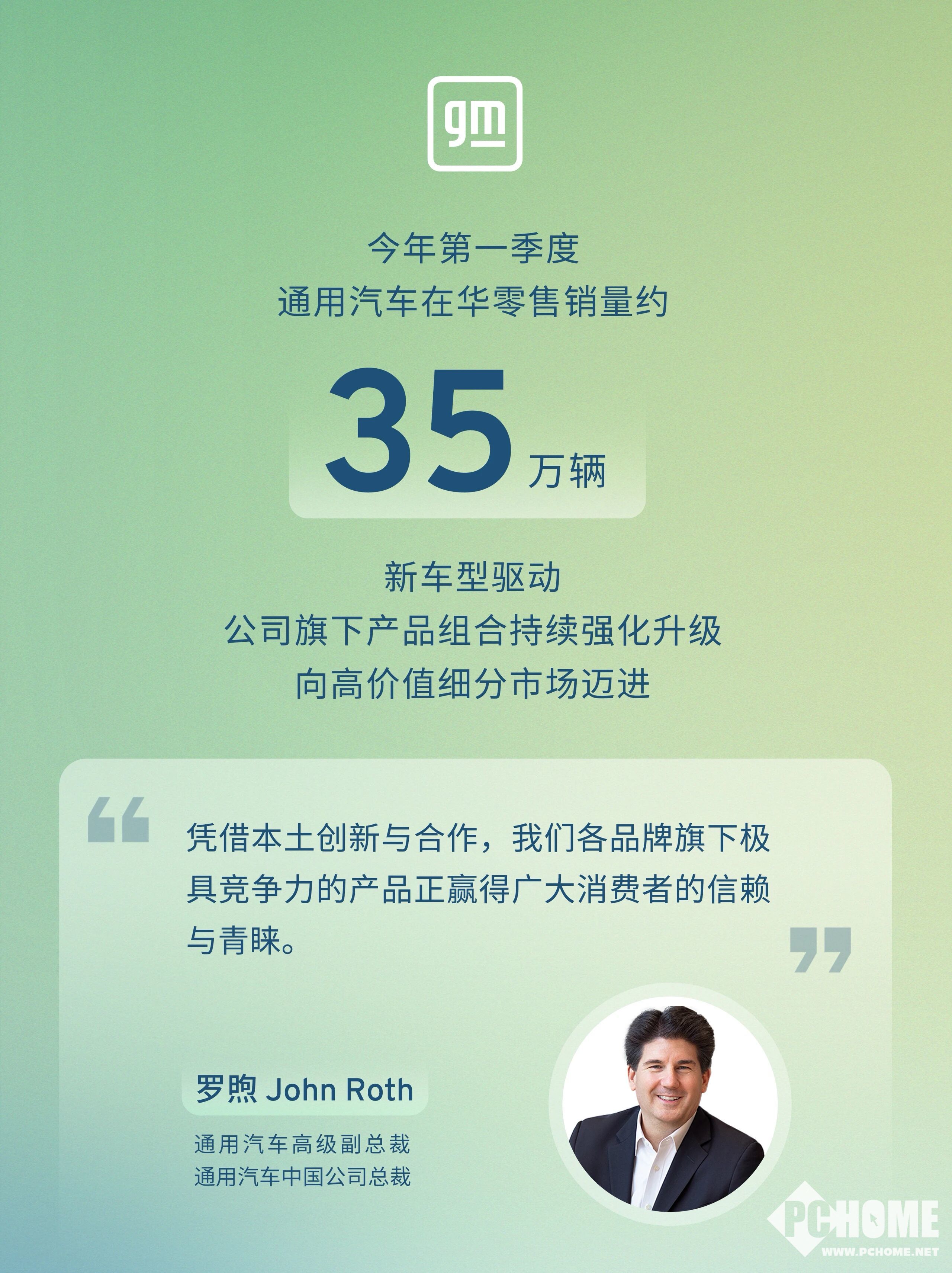 PChome 4月3日消息,通用汽车公布2026年第一季度在华市场销量数据,当期零售销量约35万辆,旗下多品牌车型表现稳健,同时宣布将在本月举行的北京车展上带来多款全新SUV与旗舰车型。