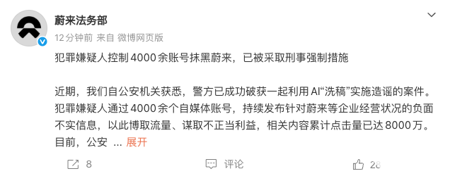 据披露,犯罪嫌疑人通过操控超过4000个自媒体账号,在抖音、快手、微信视频号、小红书等多个主流内容平台,持续、批量发布针对蔚来等企业财务状况和经营前景的负面不实信息。其核心手法是利用AI技术对信息进行“洗稿”重组,以规避平台审核,达到博取流量、谋取不当利益的目的。相关不实内容累计点击量已高达8000万次,造成了恶劣影响。目前,涉案犯罪嫌疑人已被依法采取刑事强制措施,蔚来方面也表示将跟进提起民事诉讼,追索经济损失。