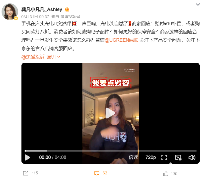 PChome 4月3日消息,近日,博主@龚凡小凡凡_Ashley在床头使用绿联65W氮化镓充电器时遭遇爆炸自燃,火星险些伤及眼睛导致毁容,而绿联客服提出的“10元退款”或“同款八折复购”方案被消费者质疑敷衍,引起舆论对产品安全与品牌责任的关注。
