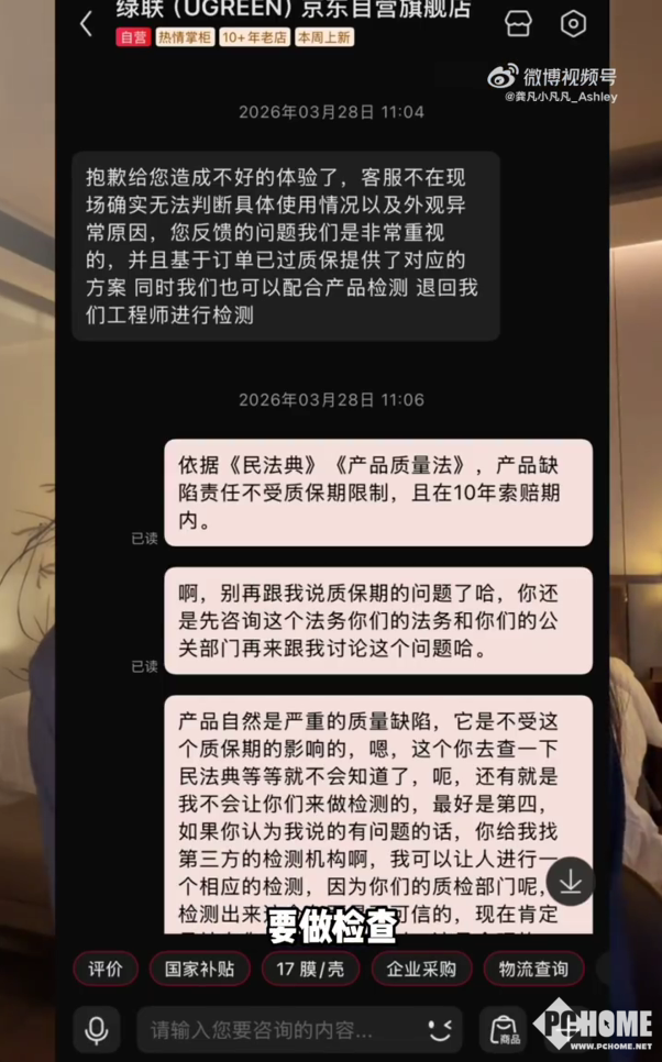 PChome 4月3日消息,3月31日,博主@龚凡小凡凡_Ashley在床头使用绿联65W氮化镓充电器时遭遇爆炸自燃,火星险些伤及眼睛导致毁容,而绿联客服提出的“10元退款”或“同款八折复购”方案被消费者质疑敷衍,引起舆论对产品安全与品牌责任的关注。