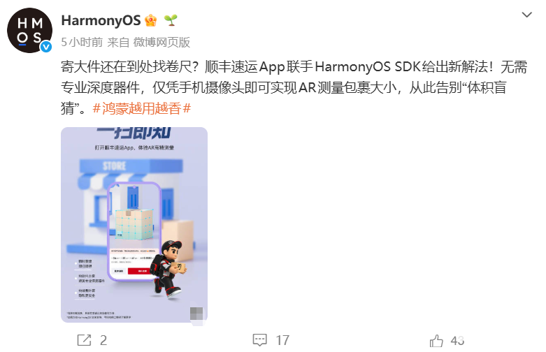 PChome 4月3日消息,华为HarmonyOS发文宣布,顺丰速运App将联动华为鸿蒙HarmonyOS SDK,上线“AR测量包裹体积+智能估算运费”功能,实现寄件流程智能化升级。