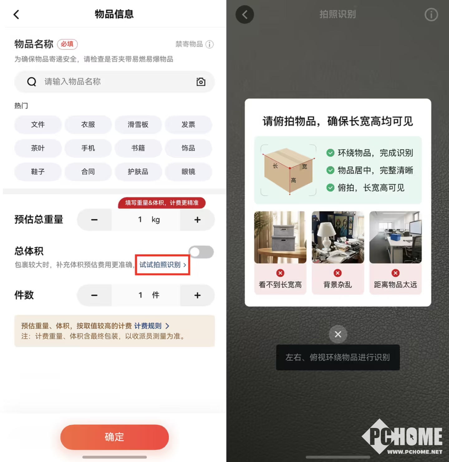 此次上线的新功能,无需额外专业器件,用户仅需打开顺丰速运App,在寄件页面点击“拍照识别”入口,通过手机摄像头环绕包裹拍摄,即可快速构建物品三维轮廓,自动精准地提取长、宽、高数据并计算体积;测量完成后,系统会结合包裹重量、目的地、运输方式等信息预估运费,全程无需手动输入数据。