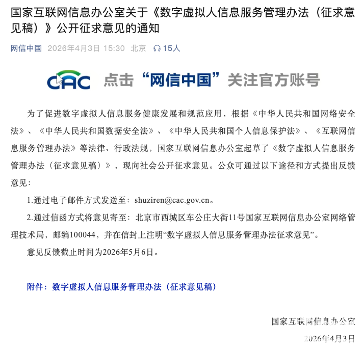 公众可通过电子邮件或信函方式提出意见,反馈截止时间为2026年5月6日。该办法的出台,将为快速发展的数字虚拟人产业划定清晰的红线,推动行业在创新与规范中平衡前行。