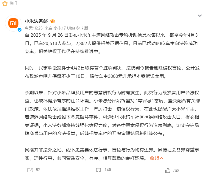 PChome 4月3日消息,小米法务部今日公布网络暴力维权专项首例胜诉结果,侵权人被判赔偿3000元并公开道歉10日,引发社会对车圈网络暴力的广泛关注。