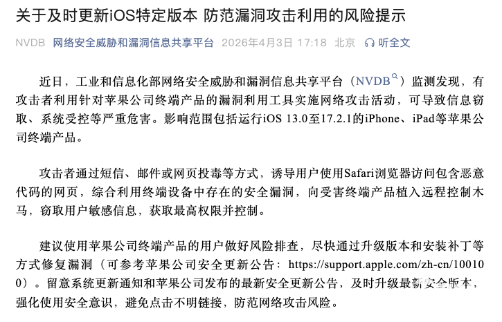 PChome 4月3日消息,工业和信息化部网络安全威胁和漏洞信息共享平台监测曝光一起针对苹果终端设备的高危攻击活动。攻击者利用iOS系统中存在的安全漏洞,通过短信、邮件或网页链接等途径诱导用户点击,一旦用户使用Safari浏览器访问恶意页面,设备即可能被植入远程控制木马,导致敏感信息泄露、系统权限被夺取,甚至手机完全被他人操控。