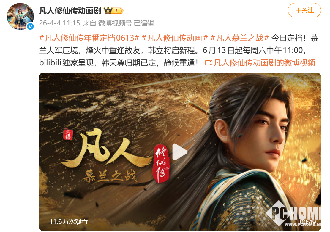 PChome 4月4日消息,《凡人修仙传》动画连续剧官方发布消息,2026年度新番定档6月13日,每周六11点由哔哩哔哩独家呈现。
