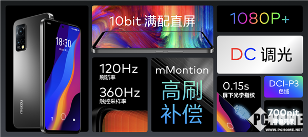 魅族18X配备了一块6.67英寸FHD+分辨率10bit OLED直屏,采用居中打孔设计,支持最高120Hz自适应屏幕刷新率、360Hz触控采样率,同时还支持 DCI-P3色域显示和mMontion高刷补偿功能。