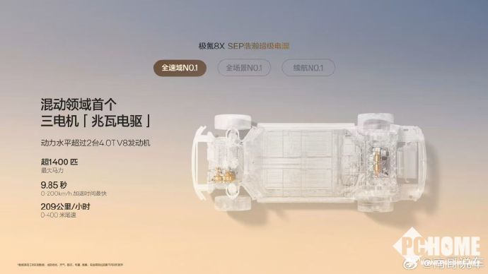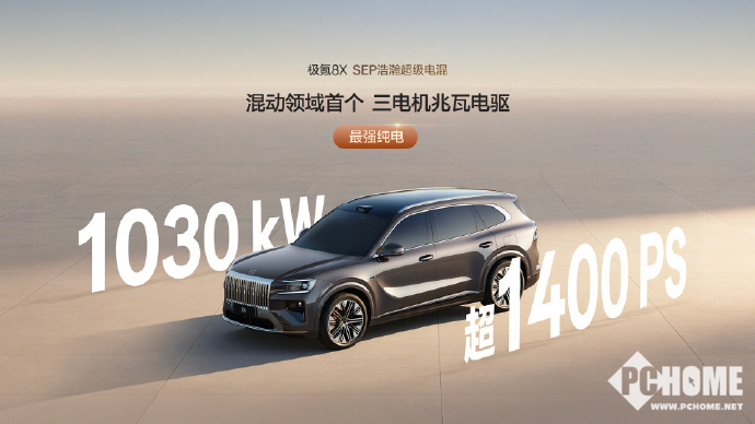 极氪8X基于浩瀚-S超级电混架构打造,全系标配900V高压平台,是混动领域首个三电机兆瓦电驱,峰值功率为1030kW,马力超1400PS;支持6C超快充,CLTC纯电续航最高达410公里,综合续航达1416公里。