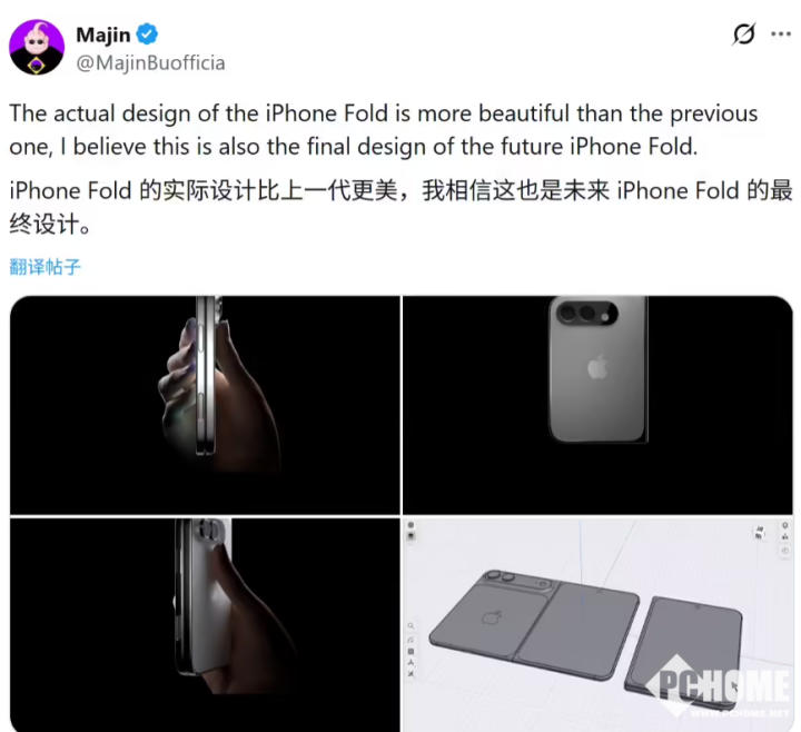 PChome 4月7日消息。据消息源Majin Bu于4月5日在X平台发布推文,并分享了一组渲染图,从多个角度展示了苹果首款折叠手机——iPhone Fold,并称新设计比此前版本更美观。