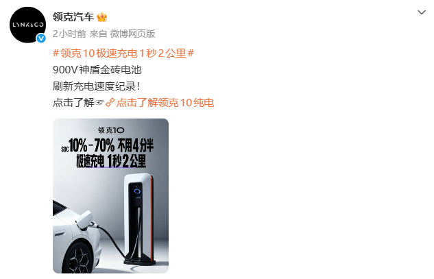 此前,领克10实测在V4极充桩上实现电量10%充至70%仅需4分22秒,以最高816km续航计算,相当于充电1秒可补充约2公里续航里程,标志着纯电车型正式进入“5分钟补能时代”。