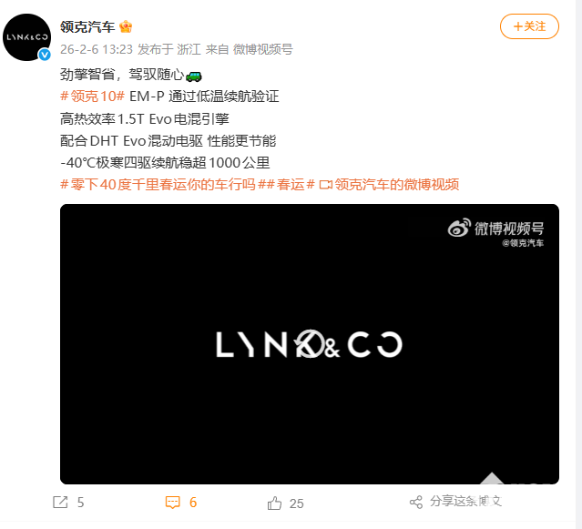 此前,领克汽车发布相关博文:领克10搭载EM-P通过低温续航验证、高热效率1.5T Evo电混引擎,配合DHT Evo混动电驱,性能更节能;-40℃极寒天气四驱续航仍然稳超1000公里。