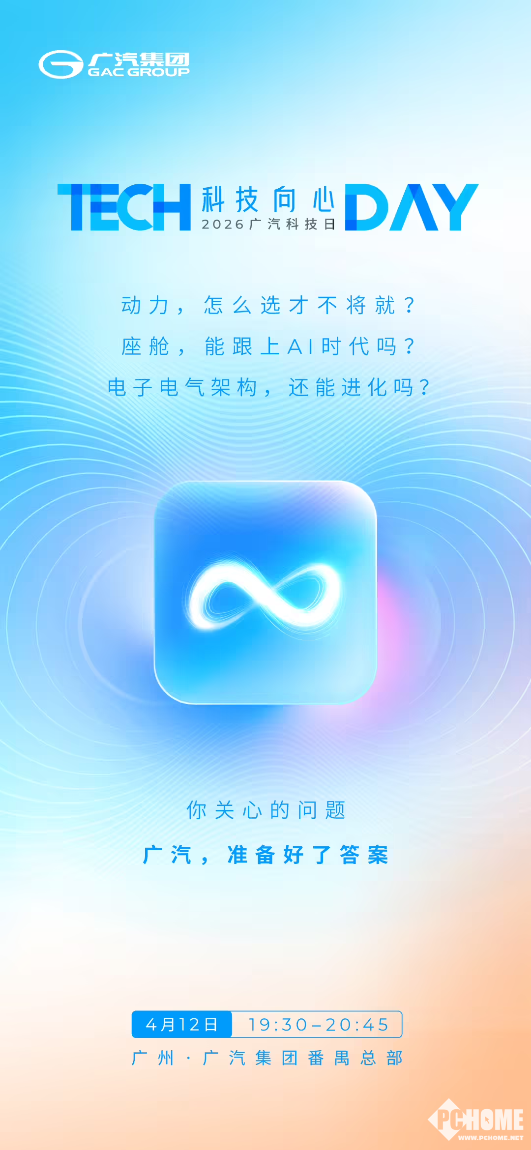 PChome 4月7日消息,今日,广汽集团官宣,以“科技向心”为主题的2026广汽科技日将于4月12日在广汽集团番禺总部举行,将发布新一代全域混动技术体系、端云一体智能座舱系统、电子电气架构等创新成果。