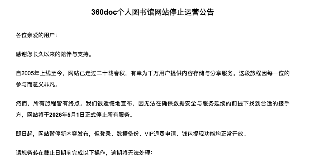 PChome 4月7日消息,国内知名个人知识管理平台360doc个人图书馆发布公告,宣布因创始团队无法找到确保数据安全与服务延续的合适接手方,平台所有服务将于2026年5月1日正式停止。