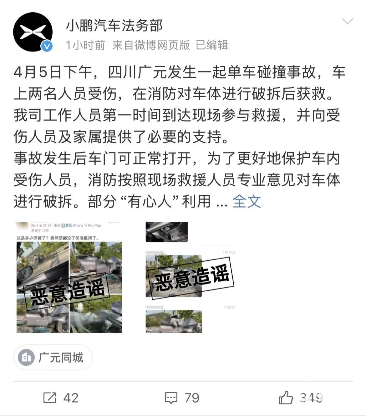 PChome 4月7日消息,小鹏法务部发布官方声明,回应近日网络上流传的“四川广元单车碰撞事故”相关争议。声明指出,网传“车顶没了,车辆散架了”的图片实际上是消防人员为救人所进行的专业破拆,并非网络上所说的“碰撞所致”。