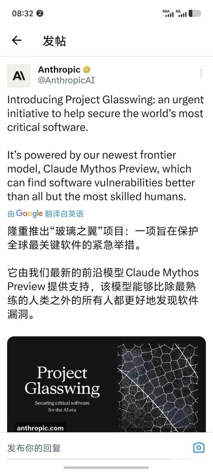 PChome 4月8日消息,AI实验室Anthropic今日正式揭晓代号为Claude Mythos的下一代AI模型。据悉该代码在代码安全性测试中展现出断层式领先,但由于其具备自主挖掘并容易利用高危漏洞的双刃属性,Anthropic宣布暂不对公众开放,同时联合苹果、微软等头部科技公司,启动代号为“Project Glasswing”(玻璃翅膀计划)的封闭防御计划。