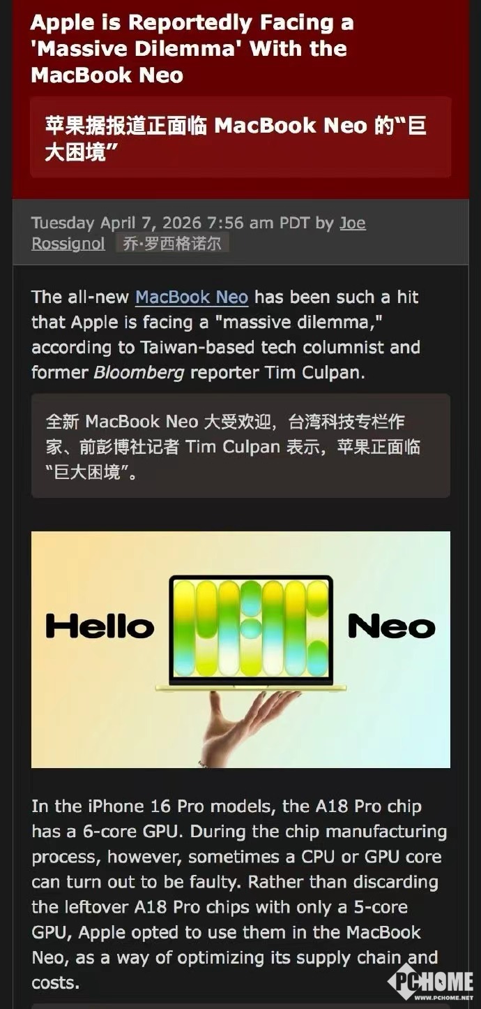 PChome 4月8日消息,苹果MacBook Neo的销量远超预期,导致A18 Pro新品库存拉响红色警报,部分渠道的发货周期已被迫延长到四月底。