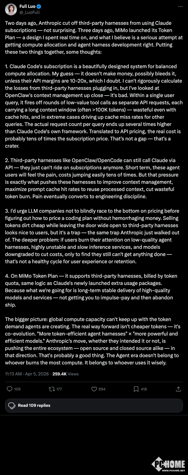 PChome 4月8日消息,小米MiMo负责人罗福莉近日公开炮轰大模型行业“Token价格战”,她直言盲目压价是陷阱,行业出路在于算力效率而非低价倾销。这一表态与近期腾讯、智谱等厂商集体涨价的动作形成呼应,标志着AI行业正从“烧钱换市场”转向价值竞争。