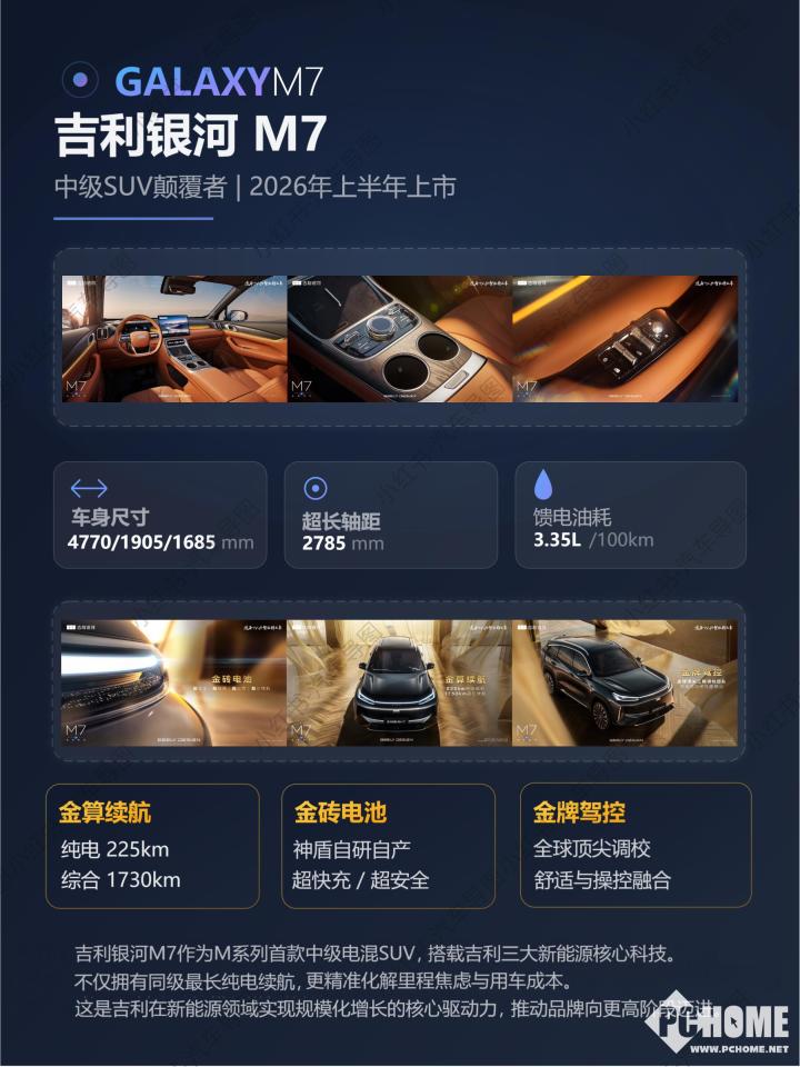 PChome 4月8日消息,吉利银河M7将于4月9日正式开启预售,新车定位紧凑型混插SUV,计划于4月下旬上市。该车基于GEA Evo架构打造,搭载超级电混系统,CLTC工况纯电续航最高225km,满油满电综合续航达1730km,旨在解决家庭用户的里程焦虑。