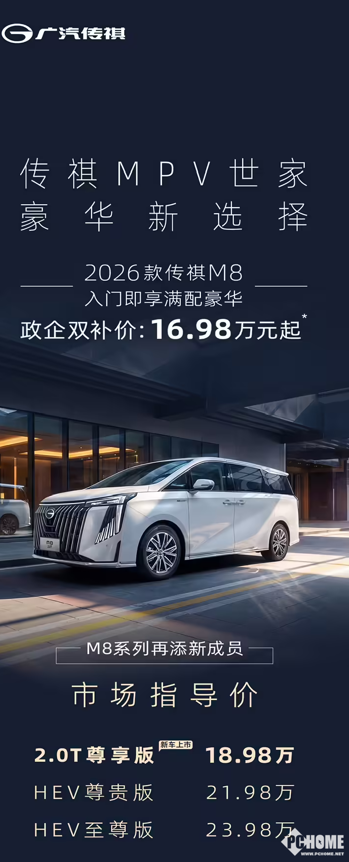 PChome 4月8日消息,今日,2026款广汽传祺M8 2.0T车型正式上市,市场指导价18.98万元起,政企双补价16.98万元起。