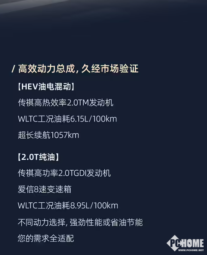 动力方面,全系均搭载2.0TGDI高功率发动机+爱信8AT变速箱,WLTC综合油耗为8.95L/100km,实现超长续航1057km。同时提供HEV混动版本可选,满足用户多样化需求。