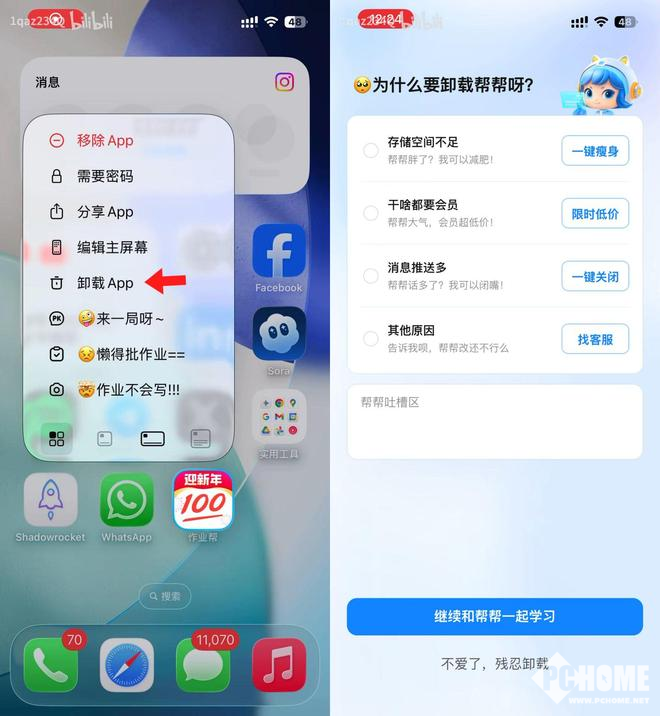 作业帮不止存在上述争议,此前,B站up主实测发现,长按iOS版作业帮APP的图标时,有一个“卸载APP”的按钮,点击该按钮实为跳转内部挽留页面,涉嫌套路用户。