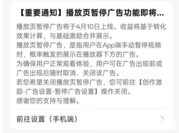 据官方通知,当用户在APP端手动暂停视频时,播放器下方将概率性展示广告卡片,明确标注并有关闭按钮,用户可在广告前后随时关闭,并且不影响视频正常播放。对于内容创作者,B站开放了后台控制权限,UP主可前往设置手动关闭,同时收益减少,将选择权交给创作者。