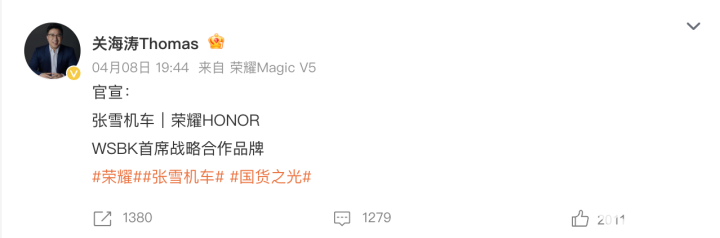 PChome 4月9日消息,荣耀全球首席营销官关海涛在个人微博宣布,荣耀成为张雪机车WSBK首席战略合作品牌。