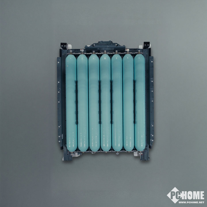 此次发布的核心在于颠覆性的空间利用和生产兼容性。该系统采用七罐并联设计,由七个碳纤维复合材料高压储氢罐集成于金属框架中,形成扁平化密封单元。这一结构优化了底盘空间的同时,还使其占用空间与第六代高压电池相当,实现了与纯电、混动车型的共线生产,提升了工厂产线的灵活性。