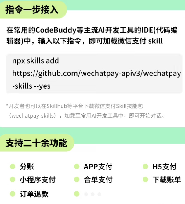 开发者可通过三步极简接入:在Cursor、腾讯CodeBuddy等AI开发工具中加载Skill,通过自然语言描述需求(如“接入单品满减券”),AI将自动生成代码并调试;同时支持20余种功能,包括分账、退款、账单下载等;并提供无资金流转的测试环境,降低试错成本。