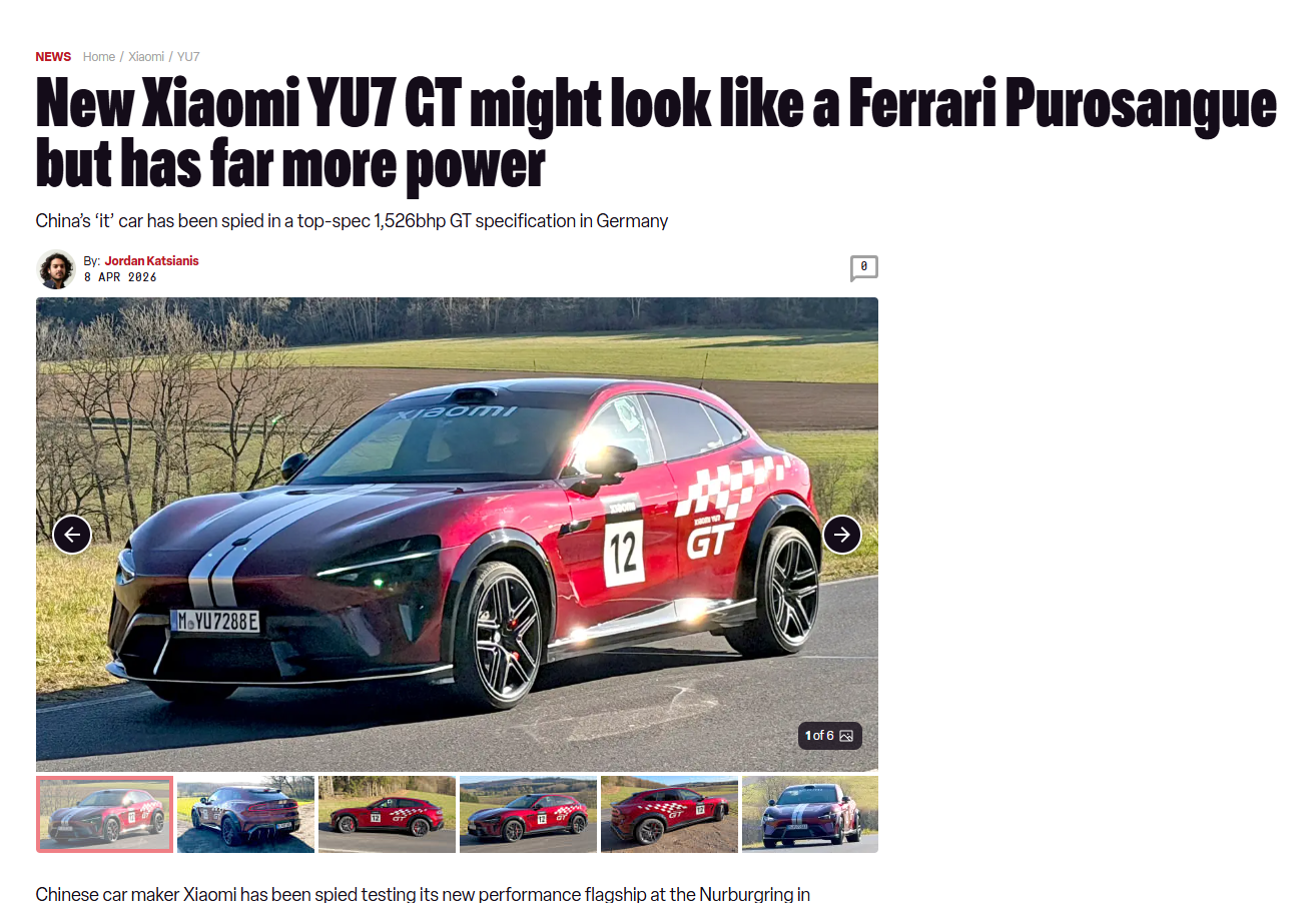 PChome 4月9日消息,汽车媒体Auto Express发布报道,称在德国纽博格林北环赛道拍到了小米YU7 GT进行无伪装测试,预计马力高达1526。新车定位纯电高性能SUV,预计今年上半年正式发布,预估售价为45万-50万元。