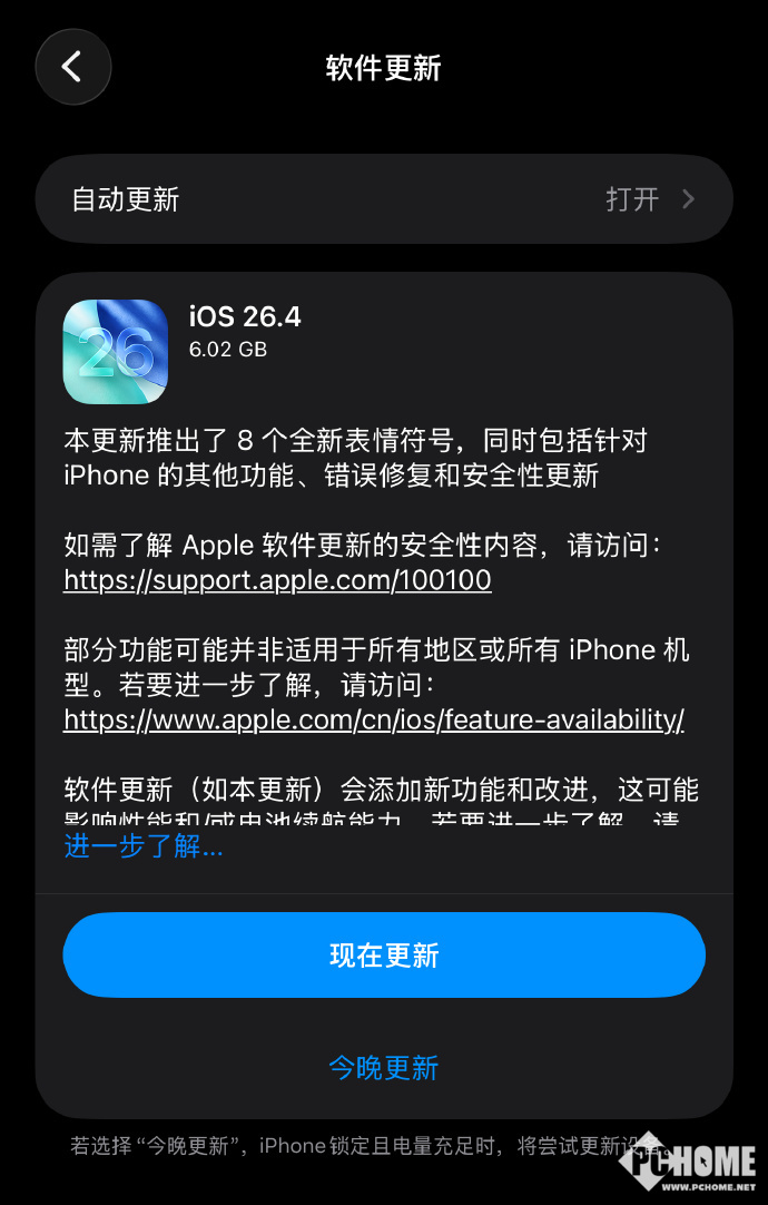 PChome根据官方更新日志做出建议:若部分用户正在使用iOS/iPadOS 26.4且遇到多设备同步异常,强烈建议升级,优化系统完整性,提升体验感;若无同步需求或设备稳定,可选择暂缓更新。更新包大小约600MB,可通过“设置→通用→软件更新”进行下载安装。