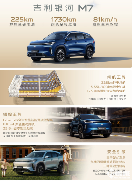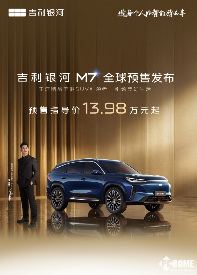 PChome 4月9日消息,今日,吉利银河M7紧凑型SUV宣布开启预售,该车搭载1.5L插电式混合动力系统,最大CLTC纯电续航为225 公里,CLTC综合续航为1730公里,预售价13.98万元起。