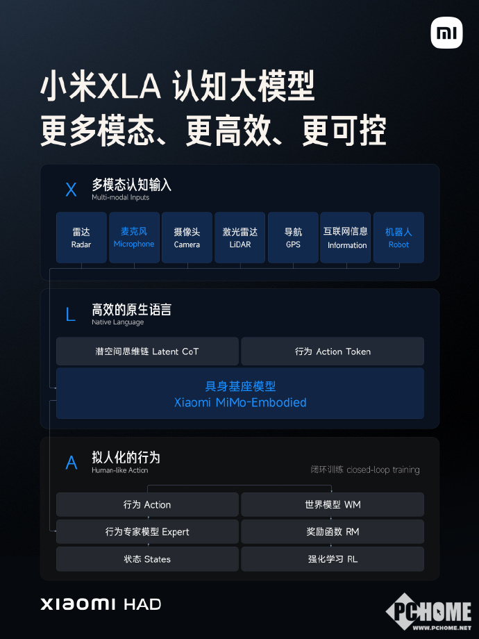 PChome 4月10日消息,小米汽车官方昨日发文,详细介绍了新一代SU7的辅助驾驶能力和Xiaomi XLA认知大模型。小米汽车认为,辅助驾驶技术迭代的关键就是让机器具备“认知”。