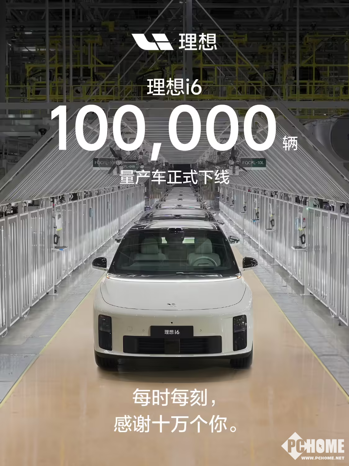 PChome 4月10日消息,今日,理想汽车官宣,理想i6第10万辆量产车正式下线。这一里程碑距离理想i6首台交付的时间不到7个月,创下25万级纯电SUV最快达成10万辆下线速度的新纪录。