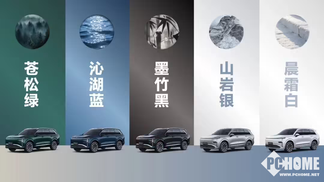 该车漆采用巴斯夫2K高透清漆,经8层工艺加持,提供五款中式车色——苍松绿、沁湖蓝、墨竹黑、山岩银、晨霜白。