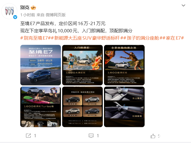 PChome 4月10日消息,今日,别克高端新能源子品牌“至境”旗下首款SUV—— 别克至境E7正式开启预售,但尚未公布具体预售价格,而是给了价格区间:16—21万元。