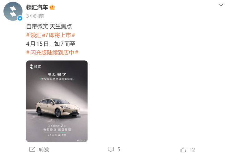 PChome 4月12日消息,今日,比亚迪领汇汽车宣布,领汇e7将于4月15日上市。新车将定位“大空间闪充中级纯电轿车”,目前闪充版陆续到店中。