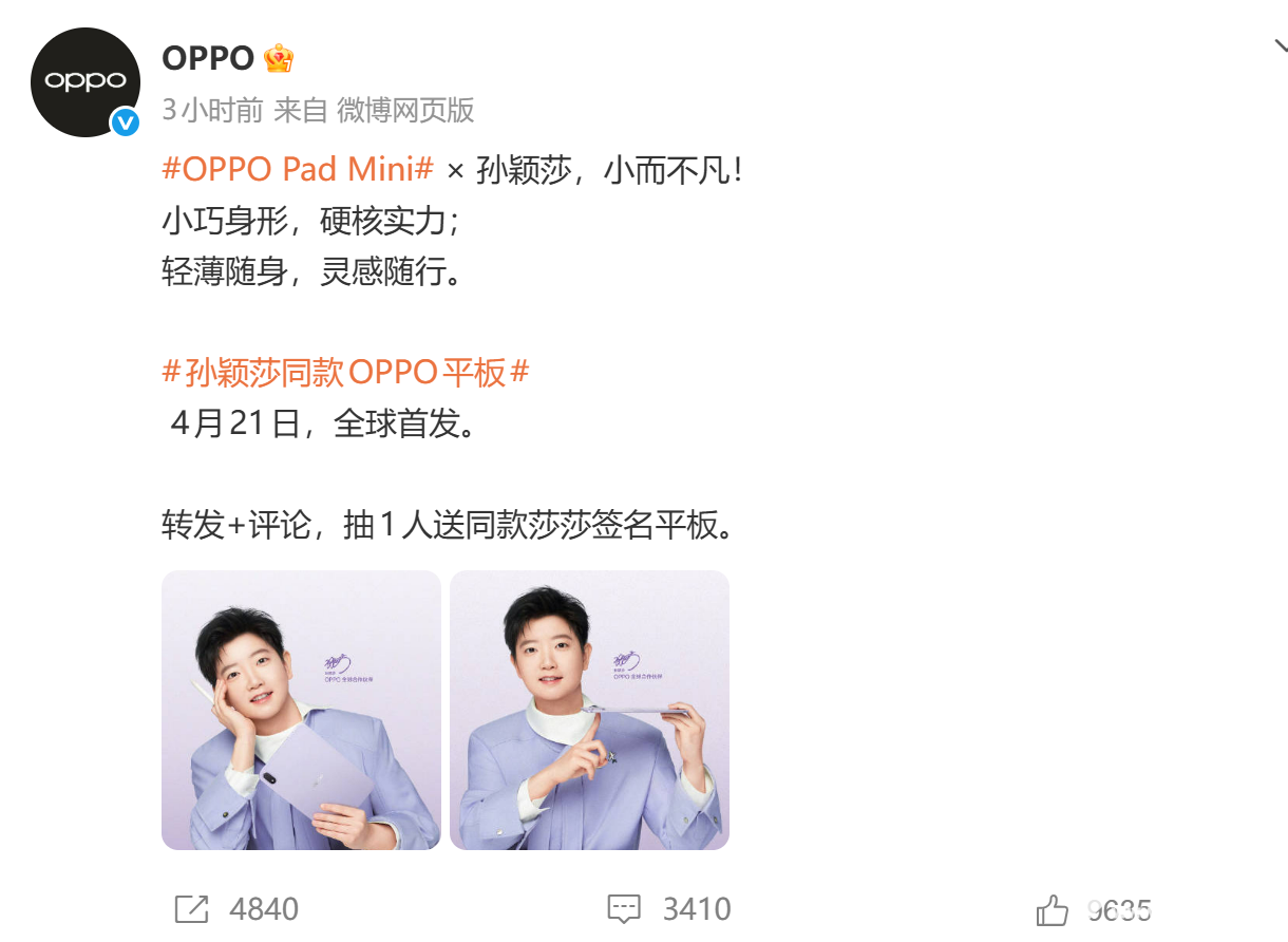 PChome 4月12日消息,今日,OPPO官宣了OPPO Pad Mini平板将于4月21日全球首发。官方海报显示,这款新品采用超轻薄设计、2.5K OLED明眸柔光屏、第五代骁龙8旗舰芯。