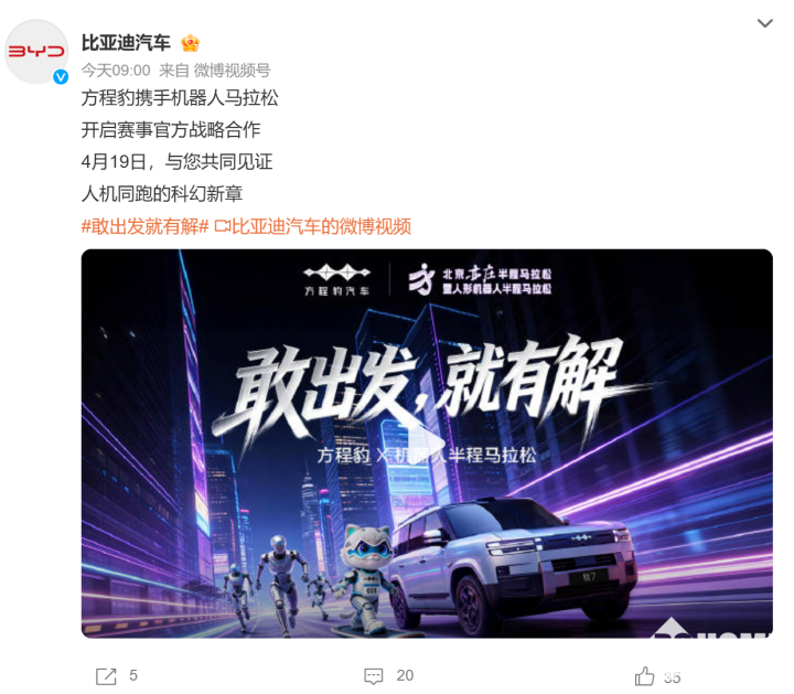 PChome 4月12日消息,今日,比亚迪汽车官宣方程豹将于4月19日一同携手机器人马拉松,开启赛事官方战略合作,与广大群众共同见证人机同跑的科幻新章。