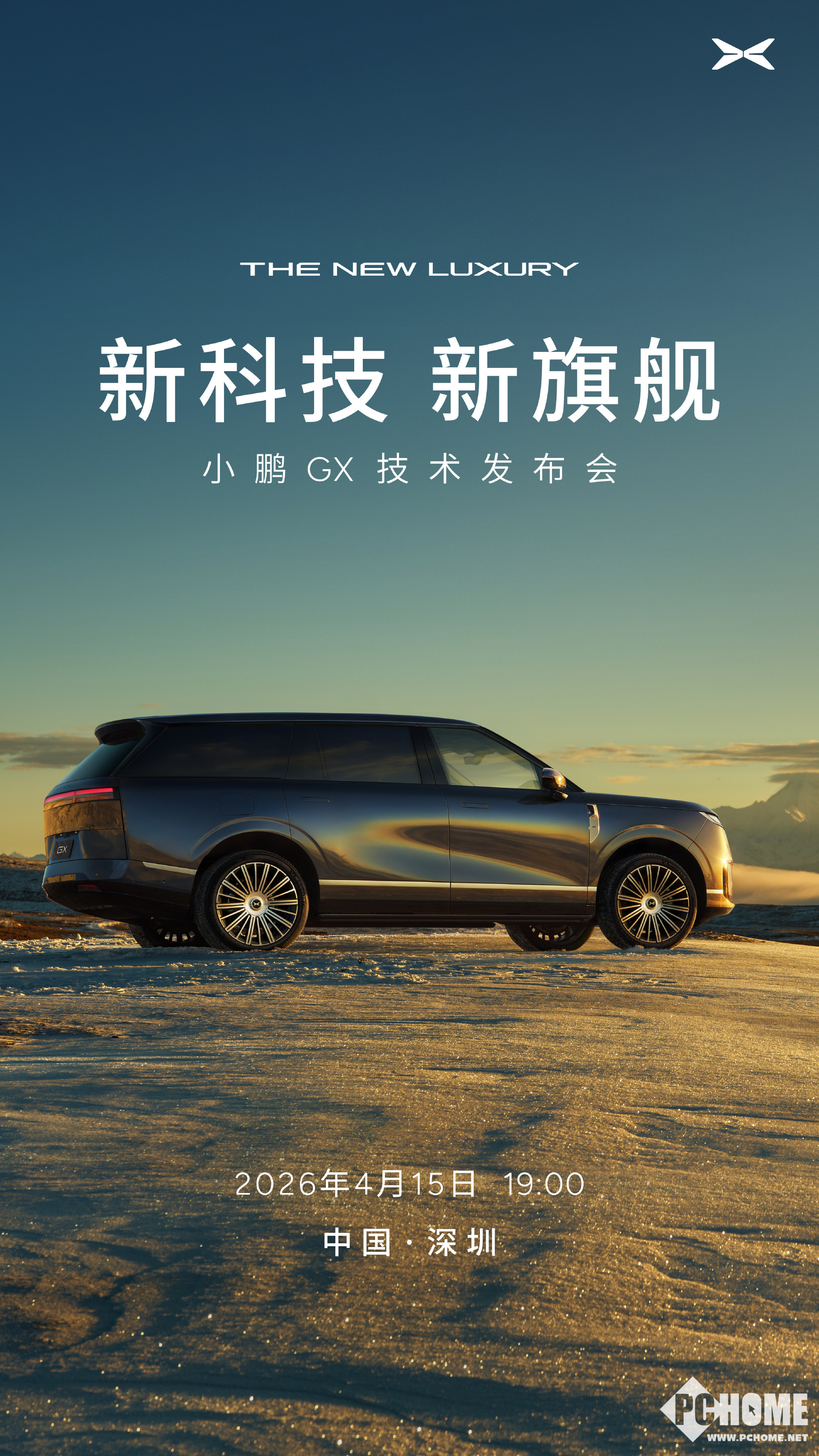 PChome 4月13日消息,小鹏汽车今日正式官宣,旗下全新SUV——小鹏GX技术发布会定档于4月15日19:00举行。官方定义它为“物理AI时代”的集大成之作。将围绕智驾、底盘、安全性与空间四大核心重新定义新科技旗舰。