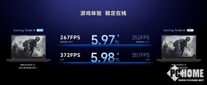 性能方面,H9机型搭载RTX 5070 Ti显卡,配合Turbo X性能调优与幻影引擎稳帧技术,在《赛博朋克2077》等游戏中帧率提升近6%。