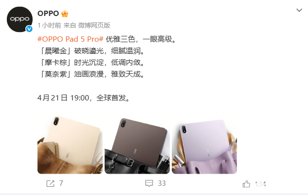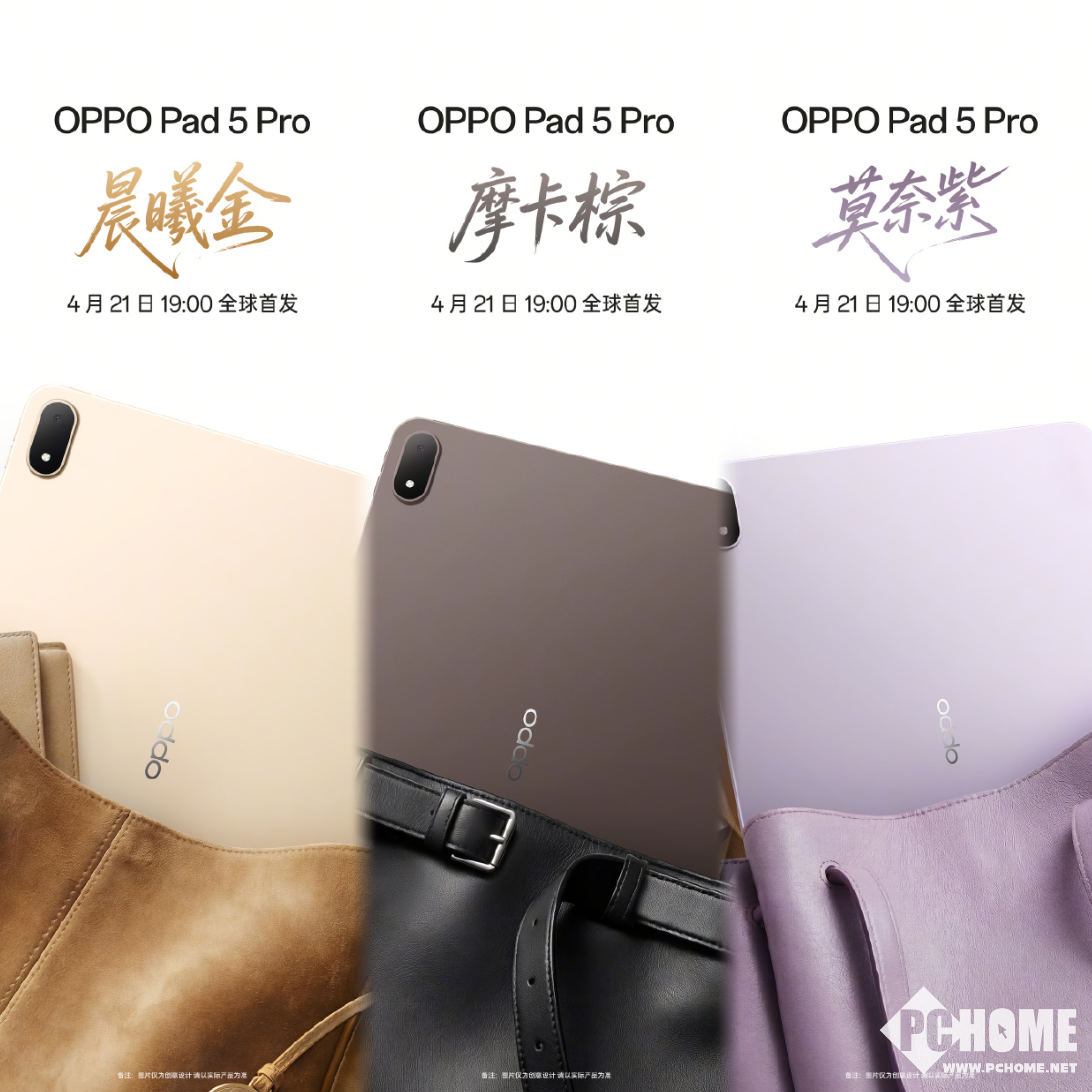 PChome 4月13日消息,今日,OPPO官方公开了OPPO Pad 5 Pro平板的外观。新机三色齐发,主打“优雅”和“高级”特点,其包括“晨曦金”、“摩卡棕”和“莫奈紫”,新机将于4月21日晚19:00全球首发。