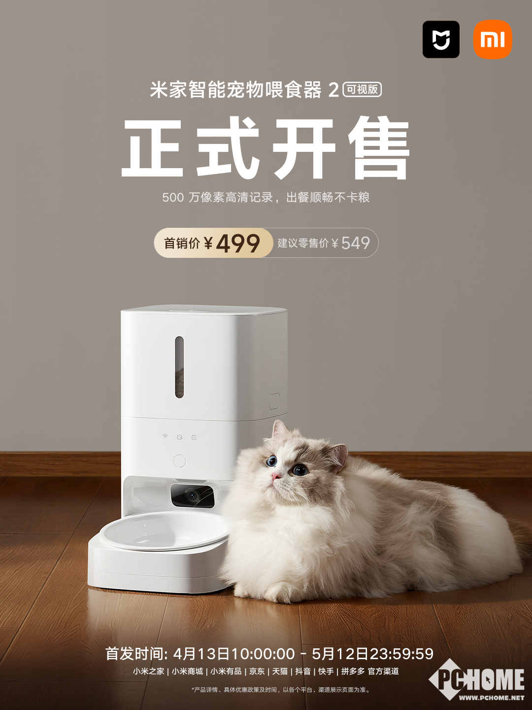 PChome 4月13日消息,小米米家智能宠物喂食器2可视版于今日开始首销,首发价499元(原价599元)。该产品最大的升级在于内置了500万像素高清摄像头,支持超广角视野与红外夜视功能,让用户可通过App远程查看宠物进食状态,并支持双向语音互动。
