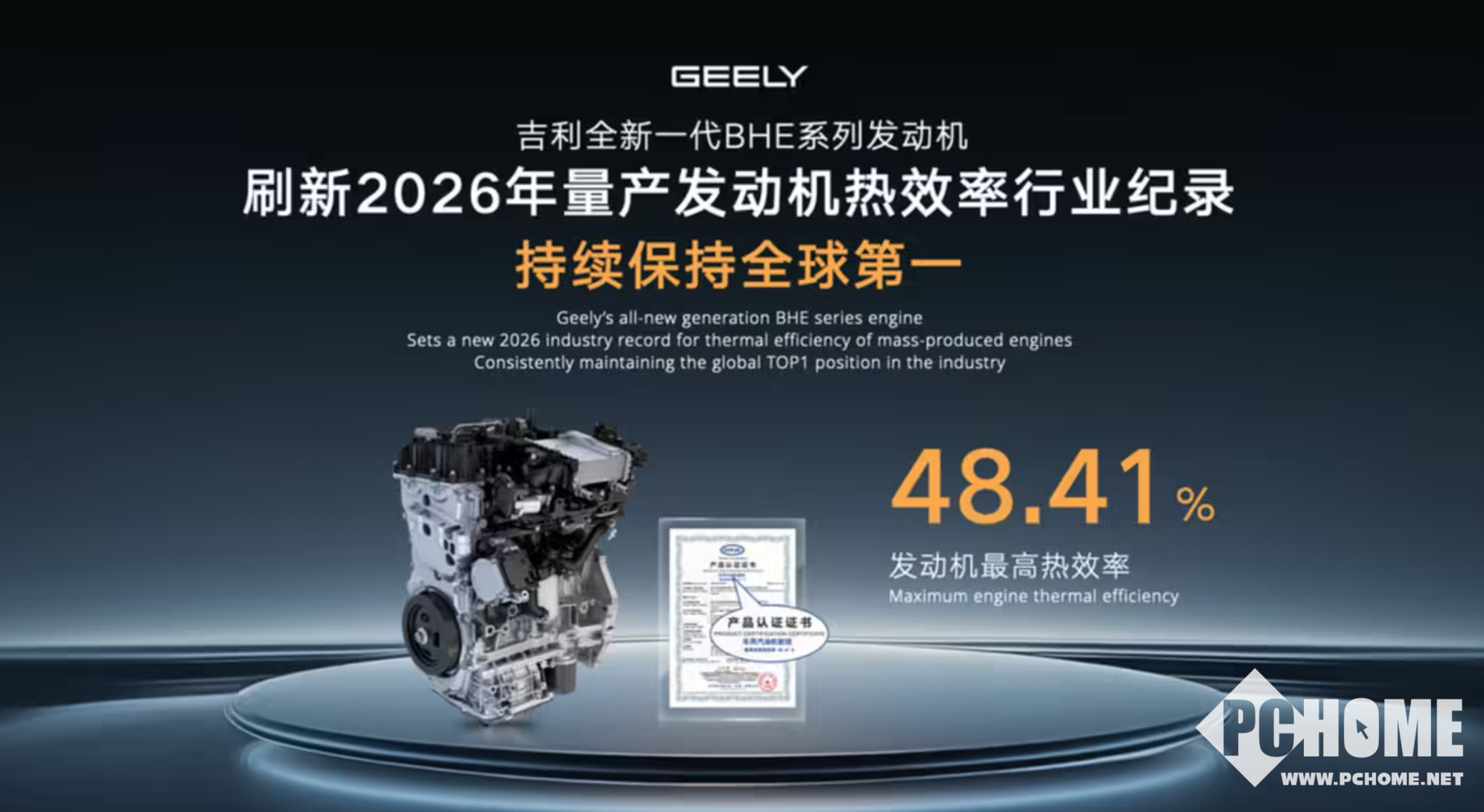 PChome 4月13日消息,吉利汽车正式发布i-HEV智擎混动技术,以48.41%的发动机热效率,创下全球量产混动最高纪录。同时宣布,2026年中国星主销产品将全面搭载该技术。