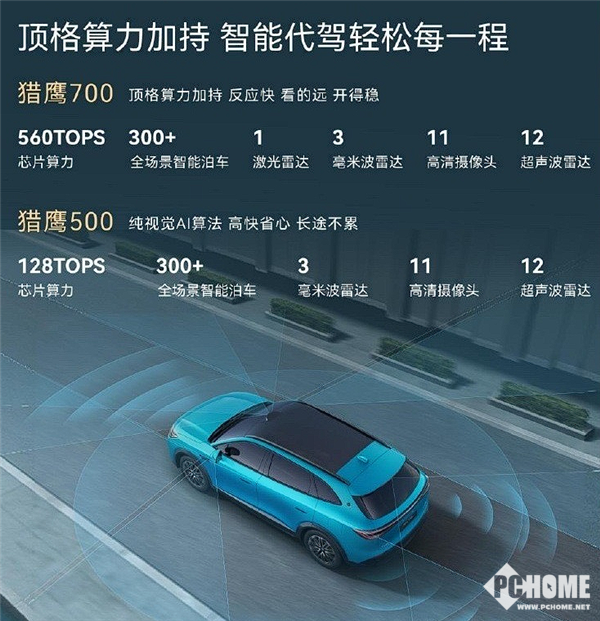 辅助驾驶部分,新车入门版载猎鹰200智能辅助驾驶系统,其它版本则会配备猎鹰500智能辅助驾驶系统;高配两款车型可花钱选装升级猎鹰700辅助驾驶,包括车顶激光雷达+地平线征程6P辅助驾驶芯片以及智驾小蓝灯等,共27颗传感器,算力560TOPS,支持城市NOA、高速NOA双场景领航和全场景自动泊车等。