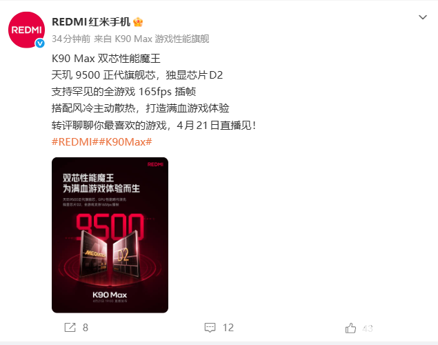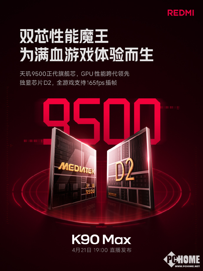 PChome 4月14日消息,REDMI红米手机官方宣布REDMI K90 Max手机发布会定档于4月21日晚7点,官方今日继续对这款新机进行预热并介绍其性能。
